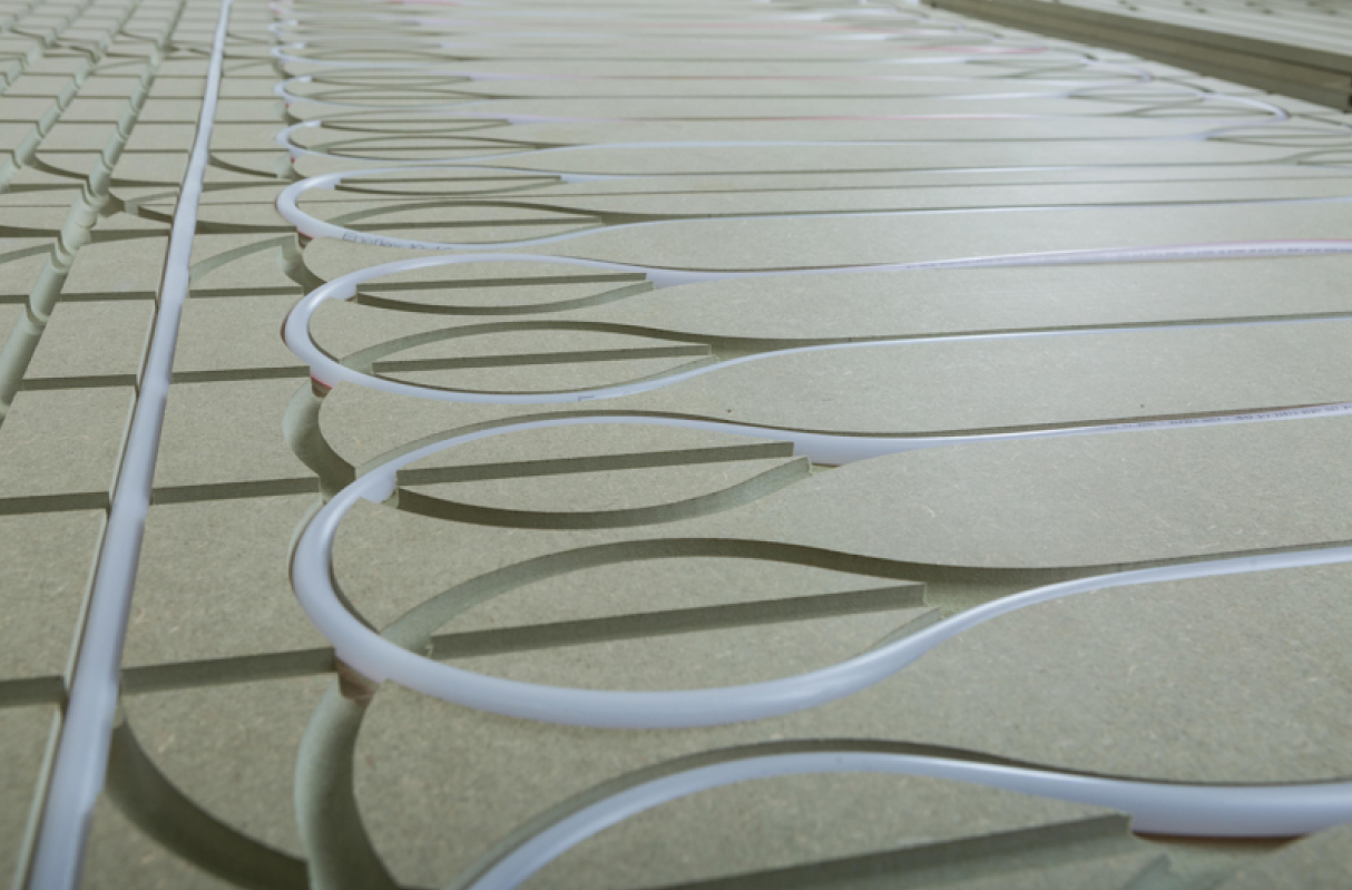 Das System kann auch als Wand- oder Deckenheizung verwendet werden, besonders geeignet für Dachschrägen. Die Basisplatte mit vorgefrästen Rohrkanälen nimmt 12-mm-Rohre auf und deckt alle Anwendungsfälle der Heizkreise ab. Für optimale Stabilität, Wärmeverteilung und glatte Oberfläche sollten die Kanäle mit Ausgleichsmasse verspachtelt werden.